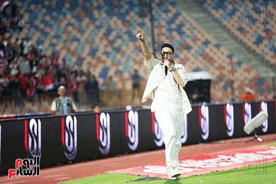 كما أشعل الفنان أحمد سعد حفل الاحتفال وبدأ فقرته بأغنية "إيه اليوم الحلو ده" التي رقص عليها لاعبو المنتخب في أجواء احتفالية عالية من كل الموجودين داخل الملعب.