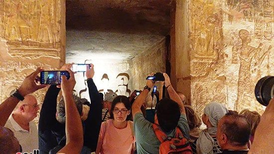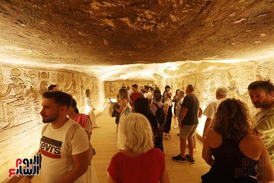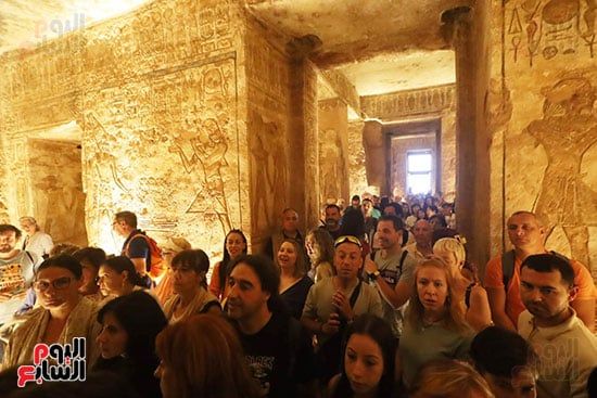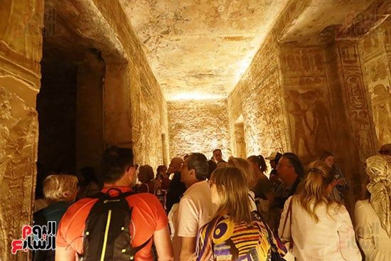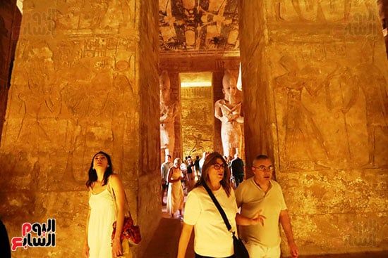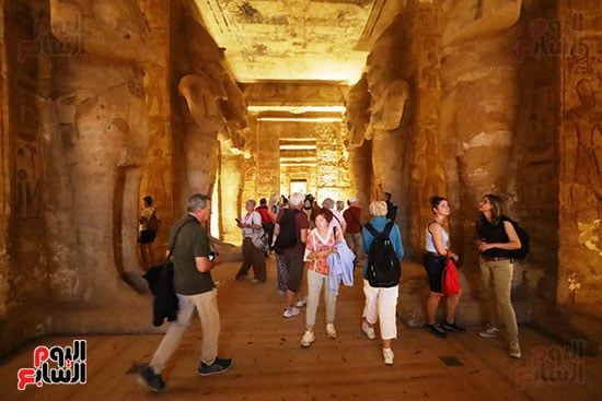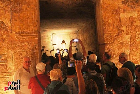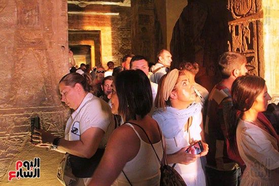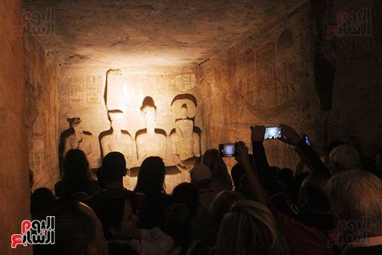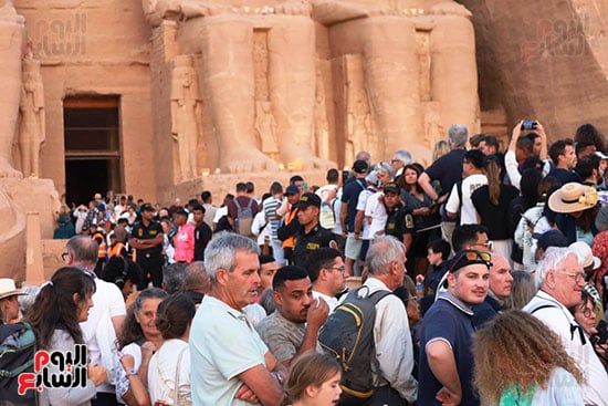 واصطف آلاف السائحين فى أطول طابور سياحى أمام معبد أبوسمبل لمتابعة ظاهرة تعامد الشمس، واحدة من الأحداث الفلكية الفريدة التى لا تتكرر إلا مرتين كل عام 22 أكتوبر و22 فبراير.