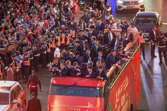 احتفل منتخب للشباب بلقب كأس العالم تحت 20 عاما عبر استقلال حافلة مكشوفة فى شوارع الرباط،  مساء أمس  الأربعاء، بعد تحقيق المركز الأول وخطف بطولة مونديال الشباب لأول مرة فى تاريخ أسود الأطلسى بالفوز على الأرجنتين فى المباراة النهائية للبطولة التى أقيمت فى تشيلى.