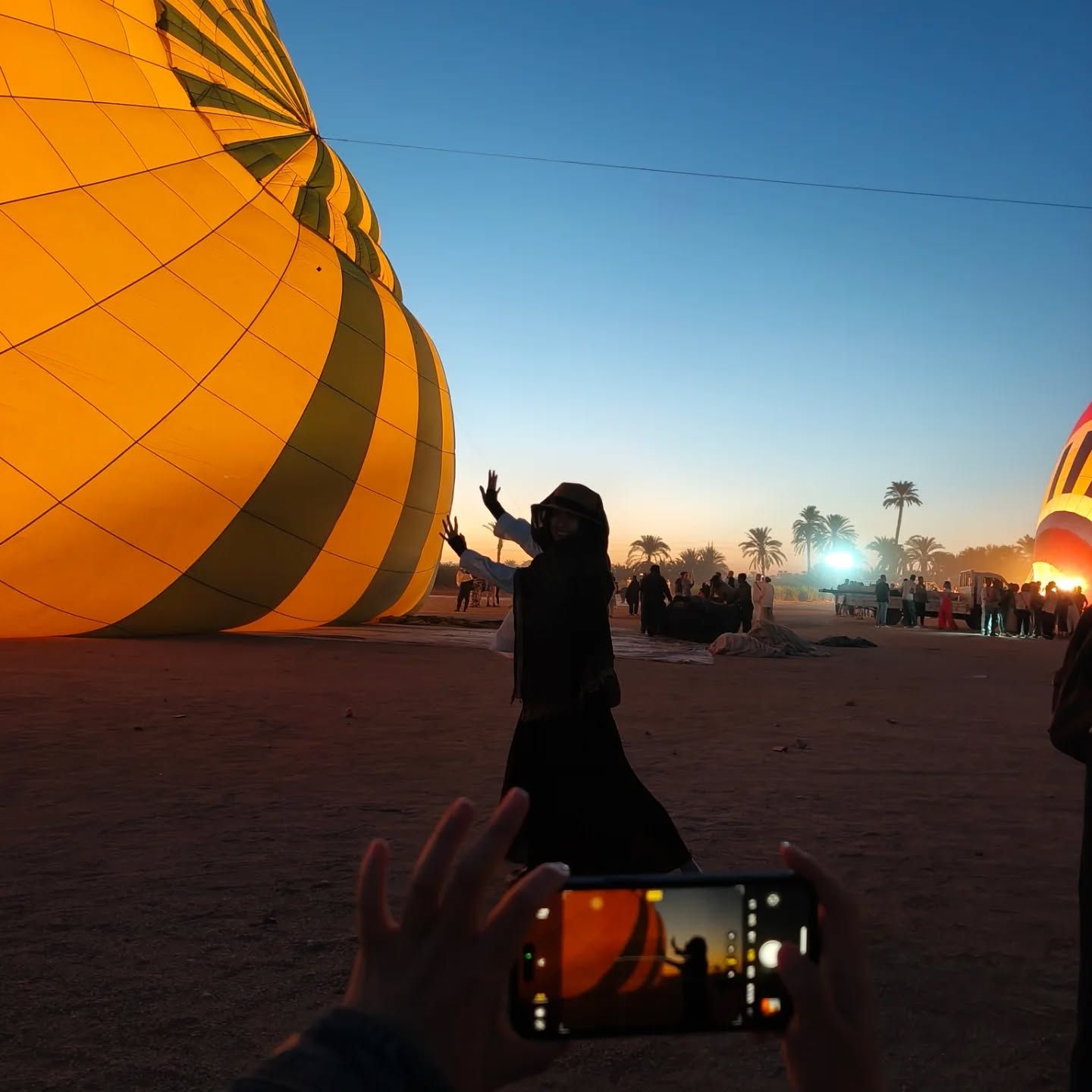 سائحة تستمتع بصورة بديعة فى أرض مطار البالون الطائر