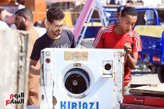 سيدة تحمل غسالة بعد شرائها من الخردة