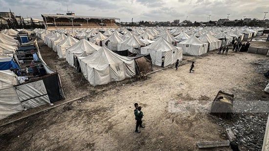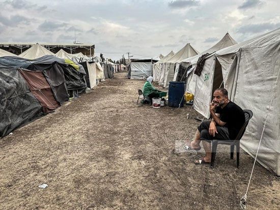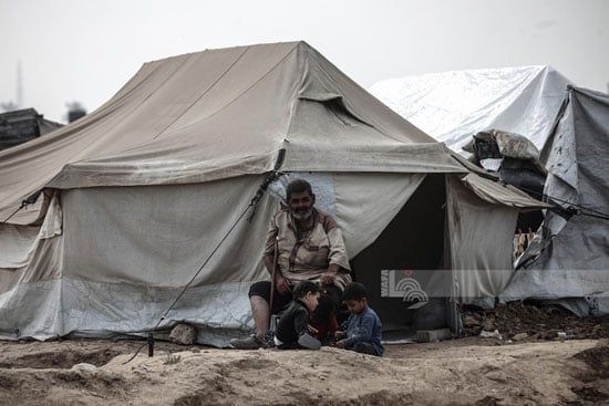 مسن فلسطينى يجلس بجوار الأطفال وسط الخيام