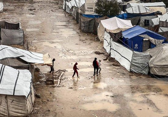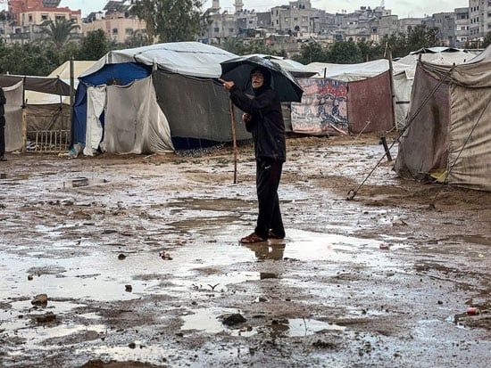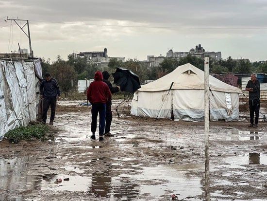 نقلت وكالة الأنباء الفلسطينية تقرير مصور من قطاع غزة يظهر حجم الضرر الكبير نتيجة الأمطار التى أغرقت الخيام الذى تعيش فيها العائلات الفلسطينية من النازحين ولمتضررين من دمار منازلهم بالكامل نتيجة الحرب الشرسة التى شهدها القطاع على مدار عامين.