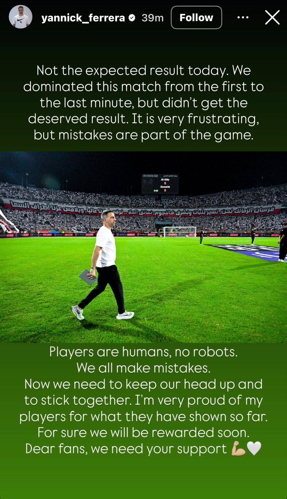 وقال فيريرا، في رسالة عبر حسابه الرسمي على "إنستجرام":"لم تكن النتيجة المتوقعة اليوم سيطرنا على المباراة من الدقيقة الأولى حتى الأخيرة، لكننا لم نحصل على النتيجة التي نستحقها إنه أمر محبط، لكن الأخطاء جزء من اللعبة."