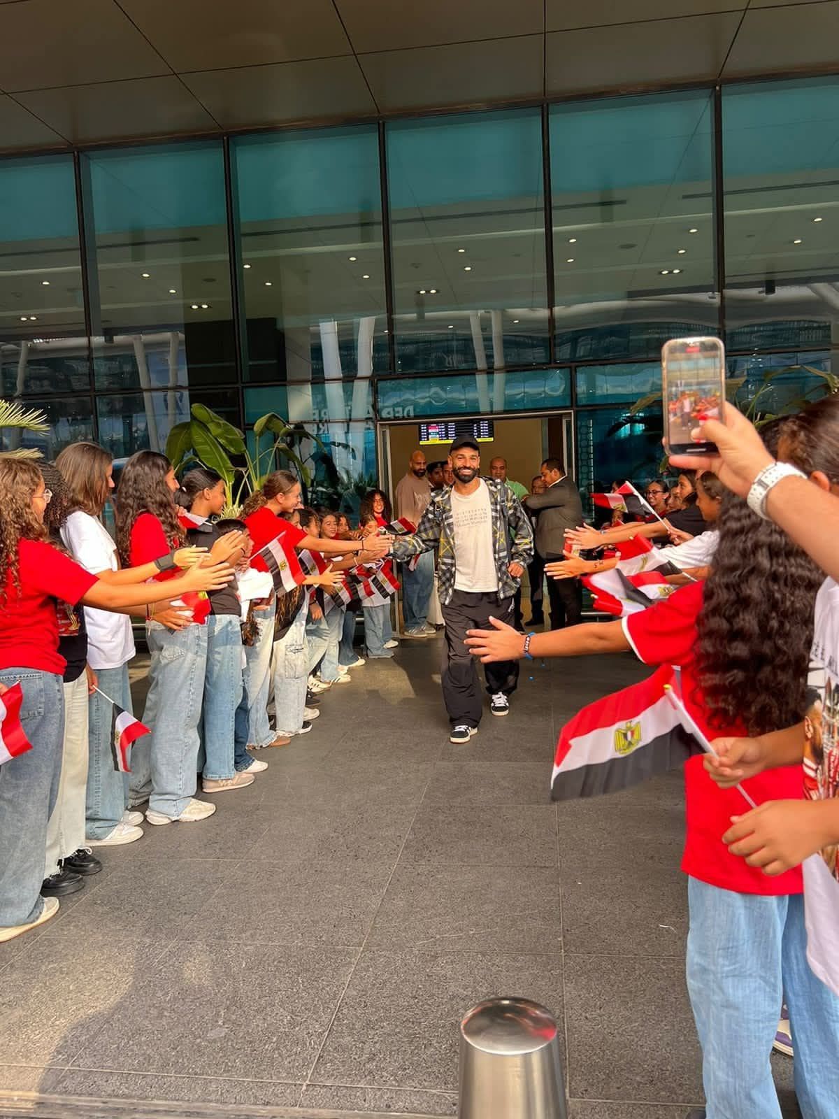 كان في استقبال محمد صلاح بعض الأطفال يحملون أعلام مصر وبعض الأصدقاء المقربين منه ومدير العلاقات العامة بالاتحاد المصرى لكرة القدم شعبان بسطاوى.