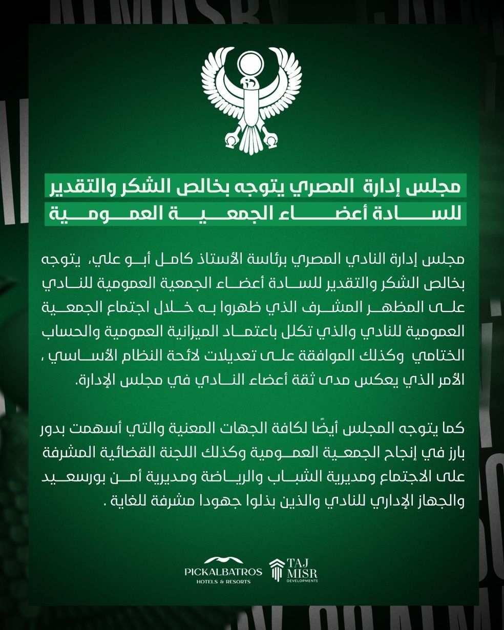 مجلس إدارة النادي المصري برئاسة كامل أبو علي، يتوجه بخالص الشكر والتقدير للسادة أعضاء الجمعية العمومية للنادي على المظهر المشرف الذي ظهروا به خلال اجتماع الجمعية العمومية للنادي والذي تكلل باعتماد الميزانية العمومية والحساب الختامي وكذلك الموافقة على تعديلات لائحة النظام الأساسي، الأمر الذي يعكس مدى ثقة أعضاء النادي في مجلس الإدارة.