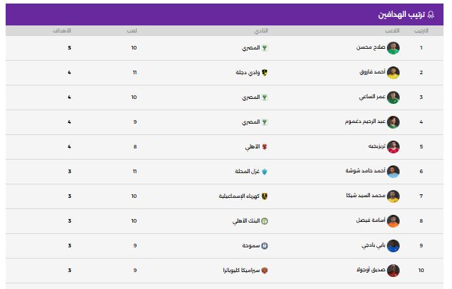 ينفرد صلاح محسن مهاجم فريق المصرى البورسعيدى، بصدارة جدول ترتيب هدافى مسابقة الدورى المصرى الممتاز المصرى برصيد 5 أهداف عقب إقامة السبت 18 – 10 – 2025، حيث واجه البنك الأهلى نظيره الجونة، بينما استضاف الإسماعيلى نظيره حرس الحدود.
