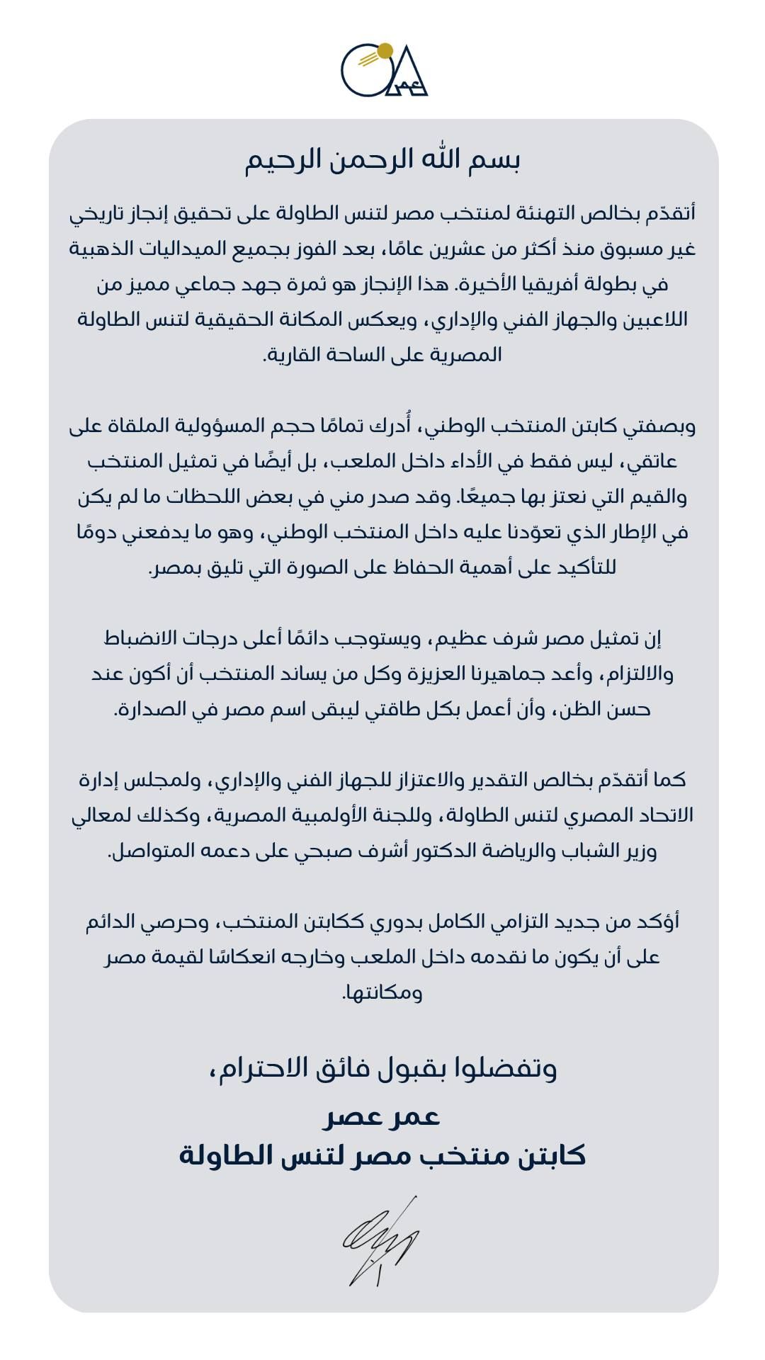 أؤكد من جديد التزامي الكامل بدوري ككابتن المنتخب، وحرصي الدائم على أن يكون ما نقدمه داخل الملعب وخارجه انعكاسا لقيمة مصر ومكانتها.
