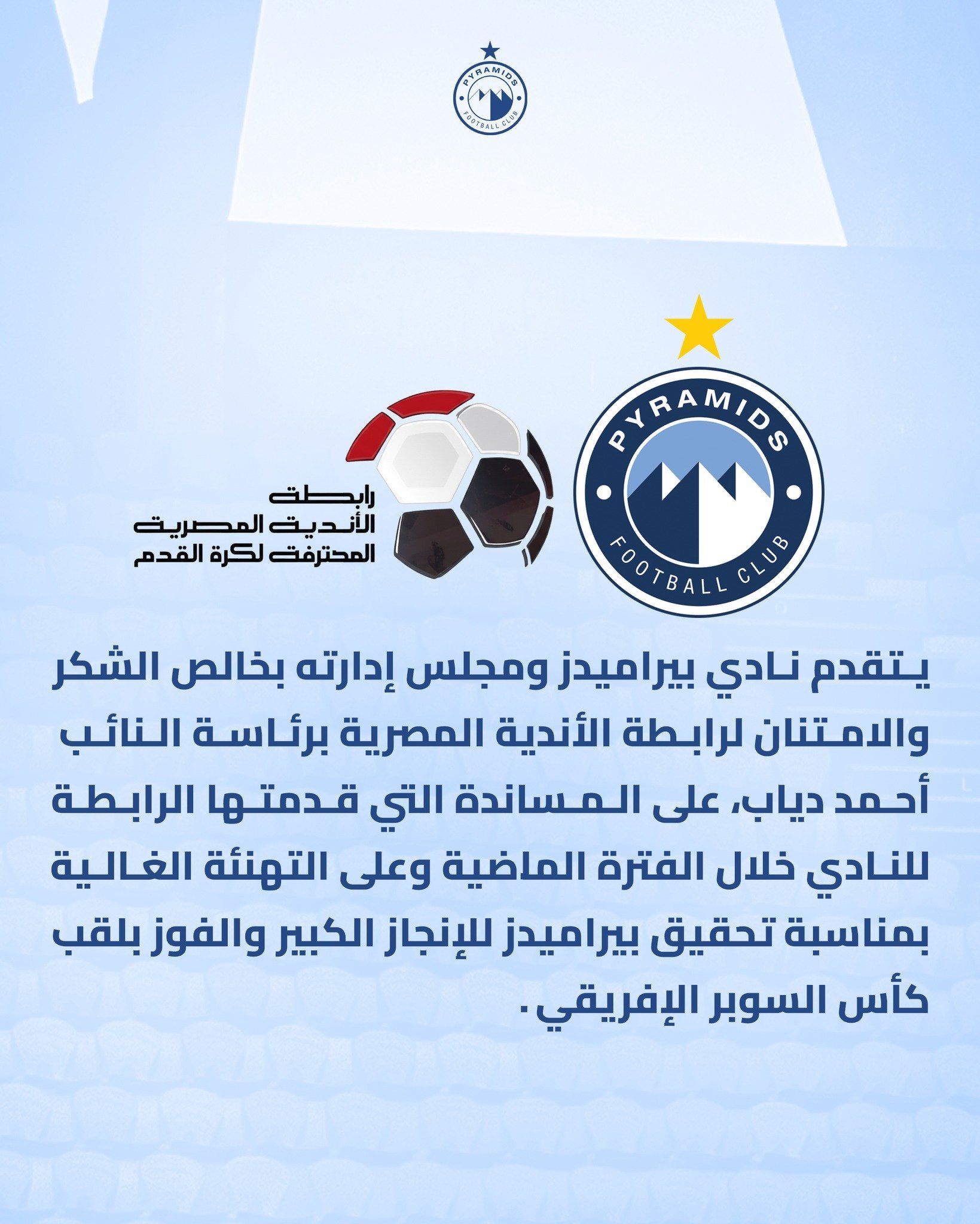 تقدّم نادي بيراميدز بخالص الشكر والتقدير إلى رابطة الأندية المصرية المحترفة لكرة القدم، برئاسة النائب أحمد دياب، على دعمها وتهنئتها بمناسبة تتويج الفريق بلقب السوبر الأفريقي.