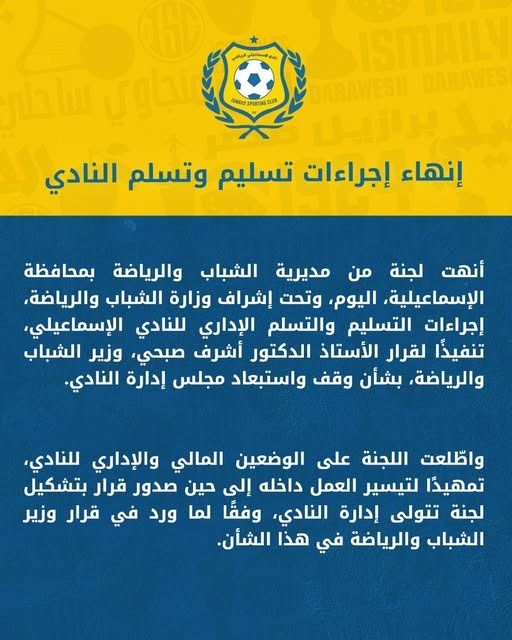 وصرح المتحدث الرسمى لوزارة الشباب والرياضة محمد الشاذلى أن قرار السيد الوزير تضمن استبعاد المجلس الحالى المحال إلى النيابة لحين انتهاء تحقيقات النيابة أو انتهاء مدة المجلس أيهما أقرب، والبدء فى تشكيل لجنة مؤقتة لإدارة شئون النادى إلى حين أقرب جمعية عمومية، على أن تتولى مديرية الشباب والرياضة بالإسماعيلية تسيير أعمال النادى لحين تشكيل اللجنة.