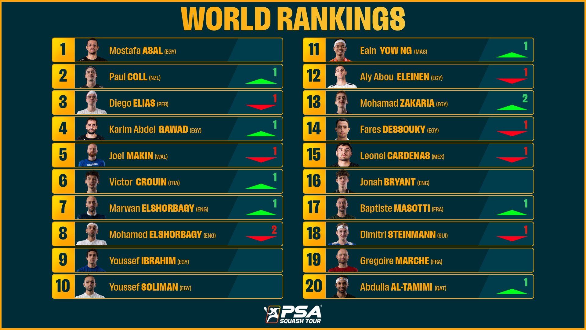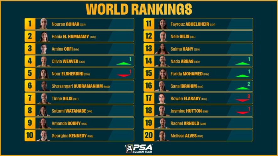 وتراجعت نور الشربيني بطلة العالم إلى المركز الخامس بعد وداعها لبطولة أمريكا المفتوحة من الدور نصف النهائي على يد أمينة عرفي، فيما تقدم كريم عبد الجواد إلى المركز الرابع.