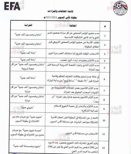 وتضمنت اللائحة أن الاعتذار عن عدم المشاركة قبل إخطار الأندية المشاركة بمواعيد السوبر "غرامة مليون جنيه وحرمان من المشاركة في السوبر لمدة عام"، والانسحاب من السوبر "غرامة 5 ملايين جنيه وحرمان من المشاركة في السوبر لمدة عامين".