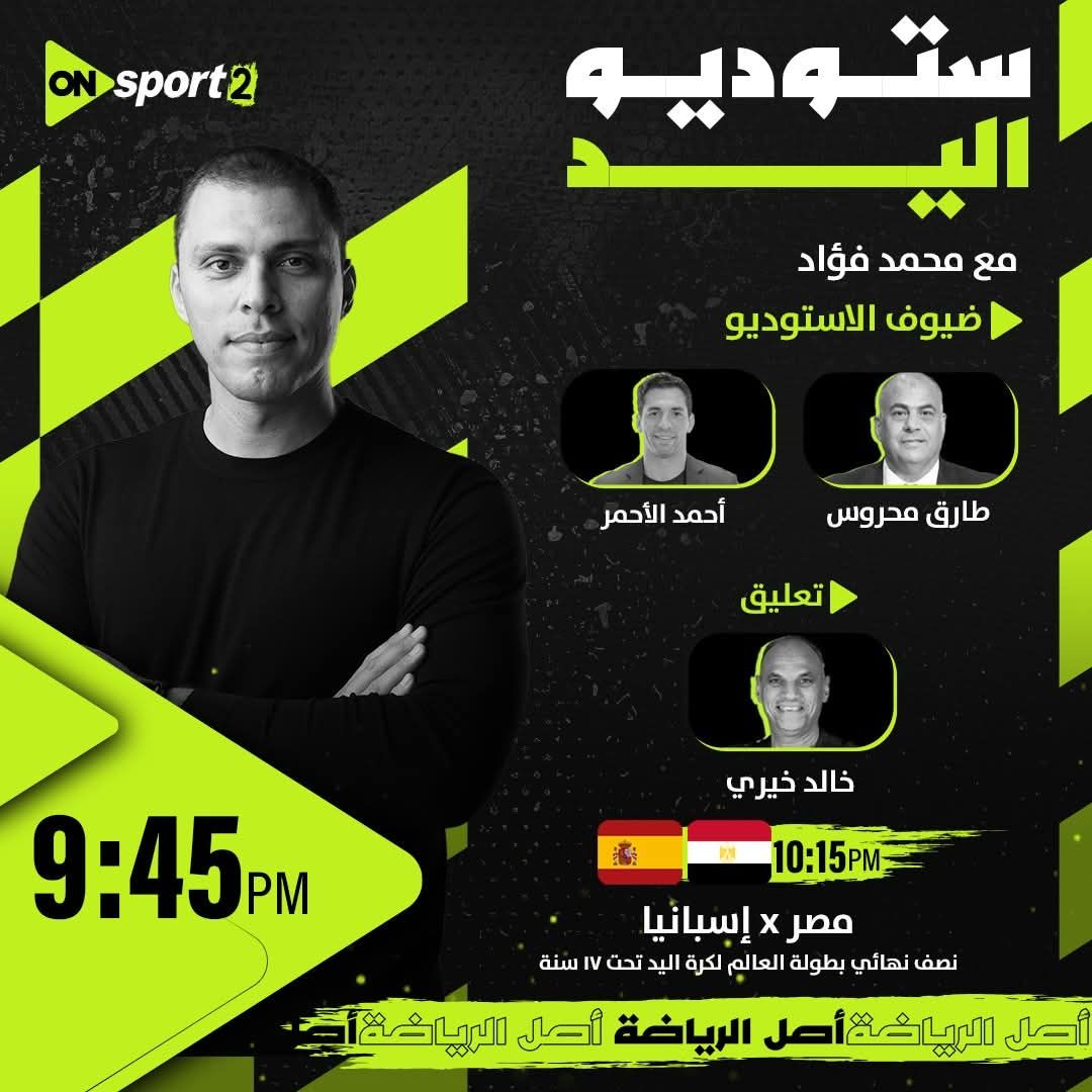 الخميس، 30 أكتوبر 2025 02:50 متقدم قنوات أون سبورت، برعاية الشركة المتحدة للرياضة، ستوديو تحليلي لمباراة منتخب مصر لناشئ اليد أمام منتخب إسبانيا في نصف نهائي بطولة العالم لكرة اليد للناشئين تحت 17 سنة، والمقامة حاليًا في المغرب خلال الفترة من 24 أكتوبر الجاري حتى 2 نوفمبر المقبل، في نسختها الأولى من البطولة.
