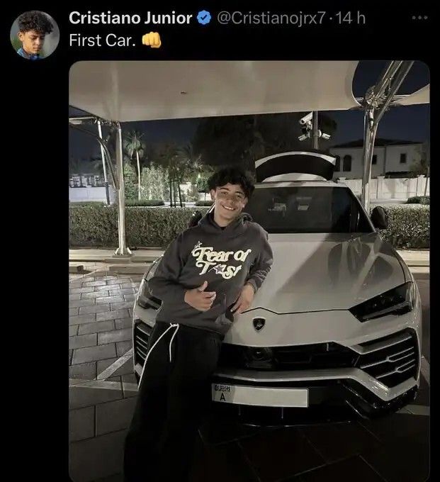 ونشر كريستيانو جونيور صورة عبر حسابه الرسمي على "انستغرام" وهو يقف أمام سيارة "لامبورغيني" بيضاء ويضع علامة إعجاب مع عبارة: "أول سيارة".