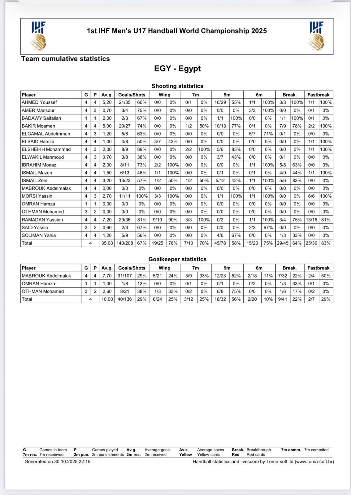 السبت، 01 نوفمبر 2025 02:52 ميتربع ياسين رمضان، لاعب منتخب ناشئي كرة اليد مواليد 2008، على صدارة هدافي أحفاد الفراعنة مسجلا 29 هدفاً خلال مشوار التأهل لمواجهة ألمانيا مساء اليوم فى نهائي بطولة العالم بالمغرب.