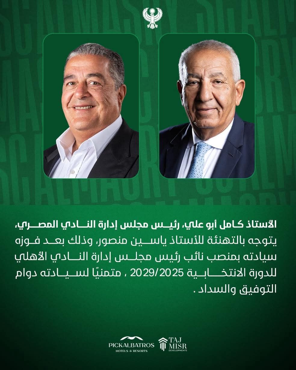 وجاءت تهنئة المصري كالتالي:كامل أبو علي، رئيس مجلس إدارة النادي المصري، يتوجه بالتهنئة لـ ياسين منصور، وذلك بعد فوزه بمنصب نائب رئيس مجلس إدارة النادي الأهلي للدورة الانتخابية 2029/2025، متمنيًا له دوام التوفيق والسداد.