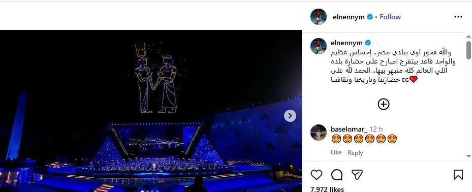 وكتب النني قائلاً: "والله فخور أوي ببلدي مصر.. إحساس عظيم، والواحد قاعد بيتفرج مبسوط على حضارة بلده اللي العالم كله منبهر بيها.. الحمد لله على حضارتنا وتاريخنا وثقافتنا."