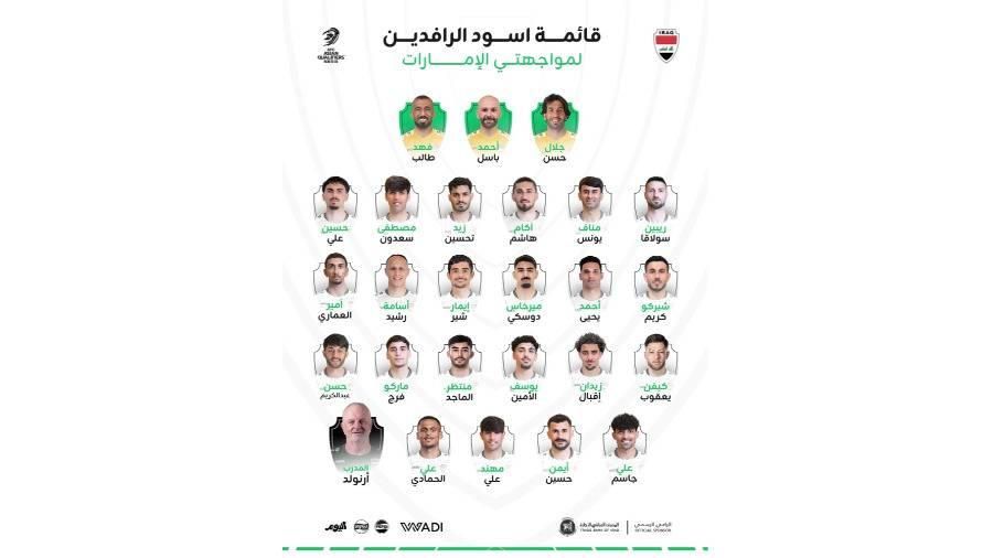 أعلن الأسترالي غراهام أرنولد، المدير الفني للمنتخب العراقي الأول لكرة القدم، الخميس، قائمة من 25 لاعباً لتمثيل «أسود الرافدين» في مباراتيه المقبلتين أمام شقيقه «الأبيض الإماراتي» ضمن الملحق الآسيوي المؤهل لمونديال 2026 اللتين ستقامان في أبوظبي في 13 من الشهر الحالي، والبصرة في 18 من الشهر ذاته.