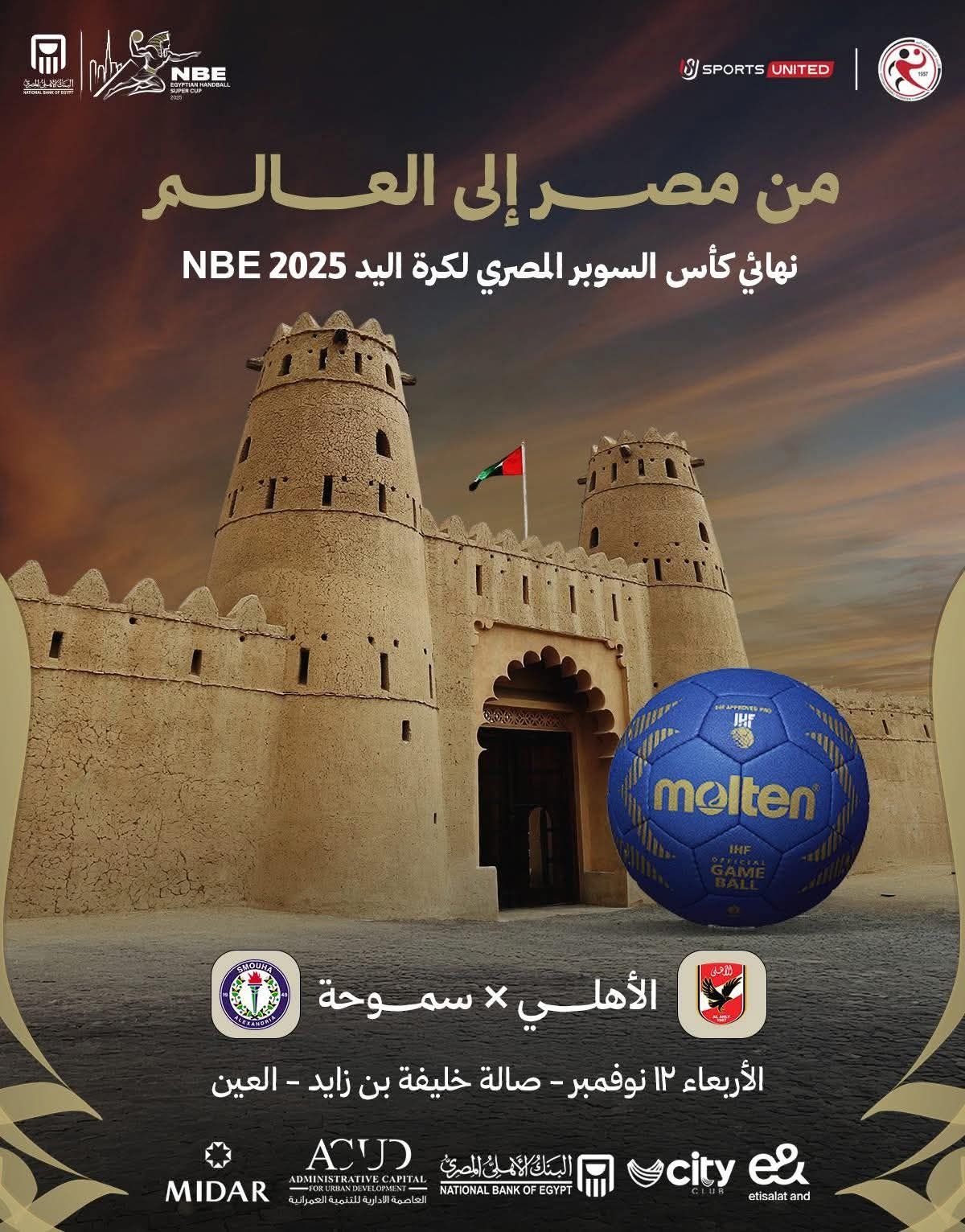 السبت، 08 نوفمبر 2025 11:04 منشرت الشركة المتحدة للرياضة عبر صفحتها الرسمية على موقع التواصل الاجتماعي "فيس بوك" إعلانا عن النهائي الكبير لبطولة كأس السوبر المصري لكرة اليد 2025، والمقرر إقامته في دولة الإمارات الشقيقة، تحت شعار: "من مصر إلى العالم.. نهائي كأس السوبر المصري لكرة اليد NBE في الإمارات".