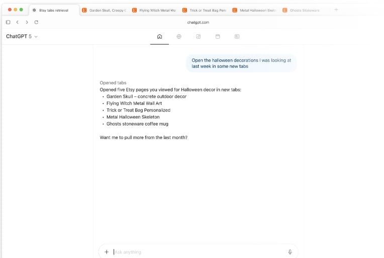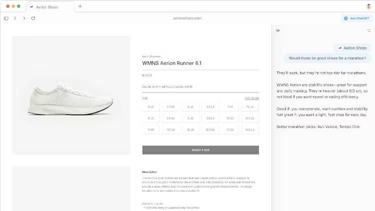 وفي كل مرة تزور فيها موقعًا إلكترونيًا على Atlas، يظهر زر "اسأل ChatGPT" صغير على الشاشة، انقر عليه، ليفتح شريط جانبي، يتيح لك الدردشة مباشرةً مع الذكاء الاصطناعي حول محتوى تلك الصفحة، هل تقرأ مراجعة طويلة؟ اطلب ملخصًا، هل تتصفح وصفات؟ احصل على قائمة تسوق أو اطلب شيئًا. هل تبحث عن مواقع سفر؟ دع ChatGPT يجد لك عروضًا أفضل.