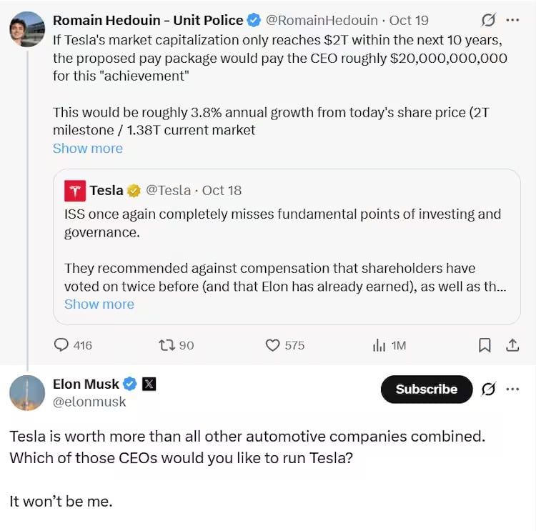 مع ذلك، دافع ماسك بقوةٍ عن موقفه، مُجادلًا بأن قيادته ضروريةٌ لمستقبل تسلا، "تسلا تساوي أكثر من جميع شركات السيارات الأخرى مجتمعة. أيّ من هؤلاء الرؤساء التنفيذيين ترغب في أن يدير تسلا؟ لن أكون أنا"، هذا ما جاء في إحدى منشوراته على موقع X (تويتر سابقًا).