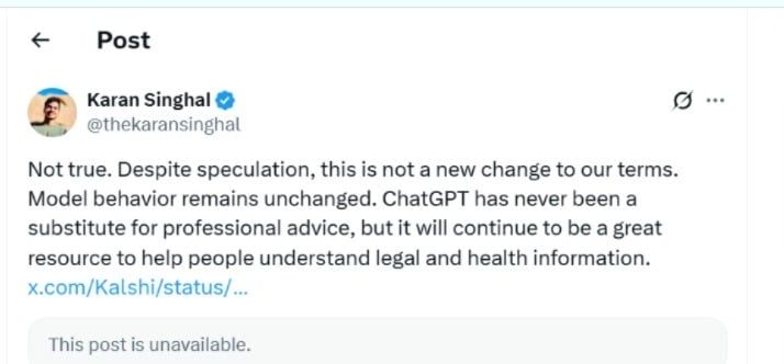 وجاء هذا الرد بعد منشور من منصة المراهنات Kalshi زعمت فيه أن "ChatGPT لن يقدم بعد الآن أي نصائح صحية أو قانونية"، قبل أن تقوم بحذف التغريدة لاحقًا، وأوضح سينغال أن السياسات الخاصة بالنصائح القانونية والطبية ليست جديدة، وإنما كانت موجودة مسبقًا ضمن شروط استخدام المنصة.