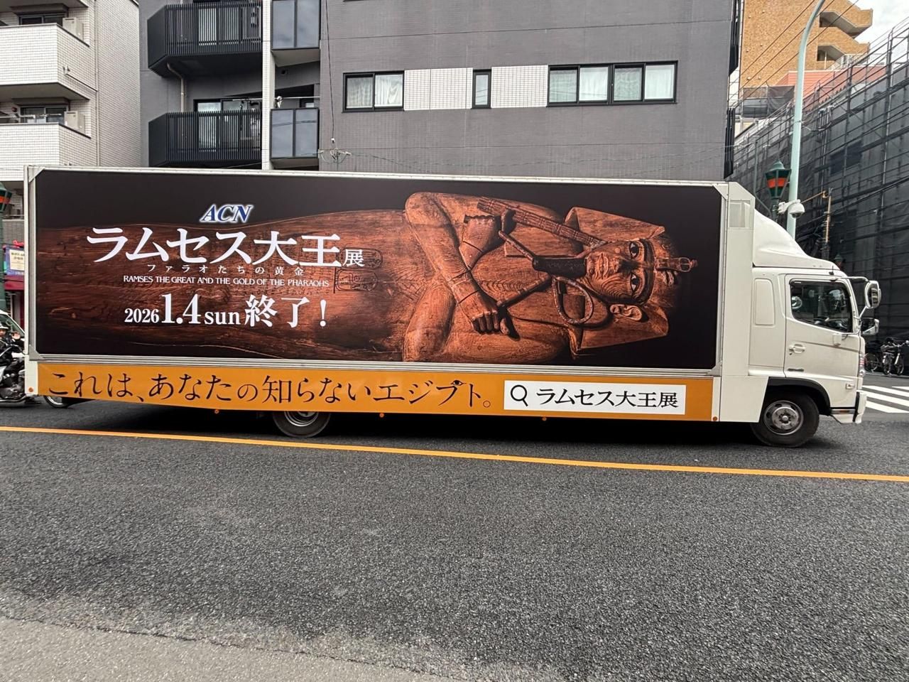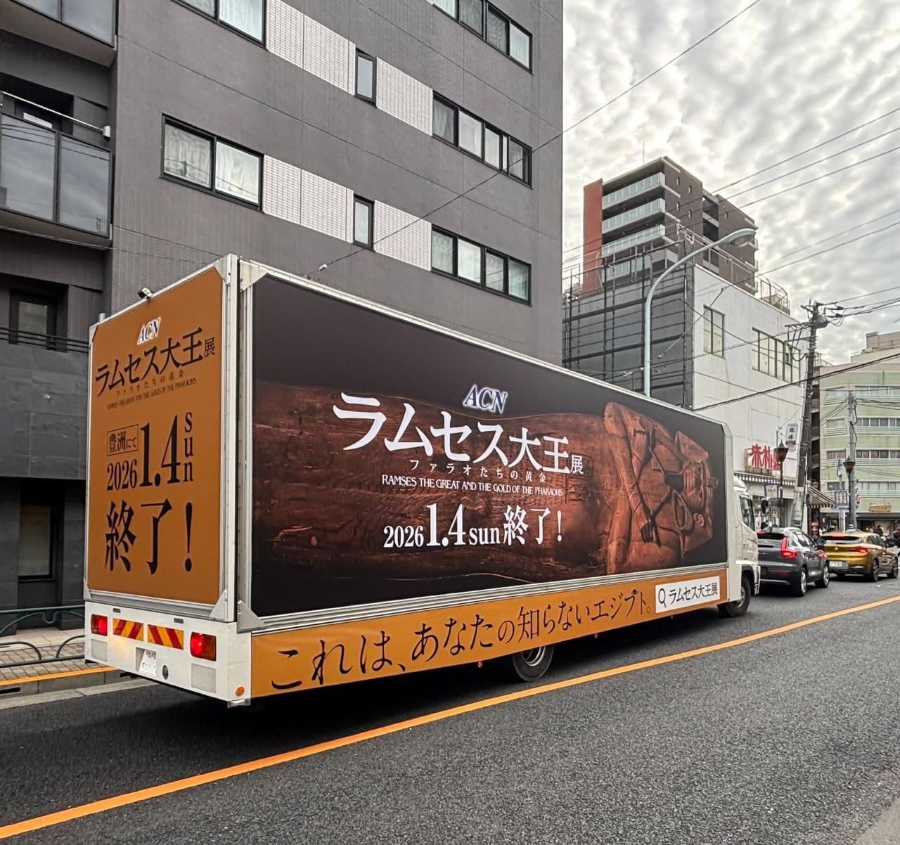 في ضوء ما يشهده معرض "رمسيس وذهب الفراعنة" المقام حالياً في العاصمة اليابانية طوكيو، من نجاح كبير وتوافد ألاف الزائرين من مختلف المدن اليابانية لزيارته، وفي إطار الحملة الترويجية الخاصة بالمعرض، تم إطلاق شاحنة دعائية متنقِّلة (Senden Truck) تجوب الشوارع الرئيسية في طوكيو وعدد من المدن اليابانية الكبرى، بهدف رفع الوعي الجماهيري بالمعرض واستقطاب المزيد من الزوار.