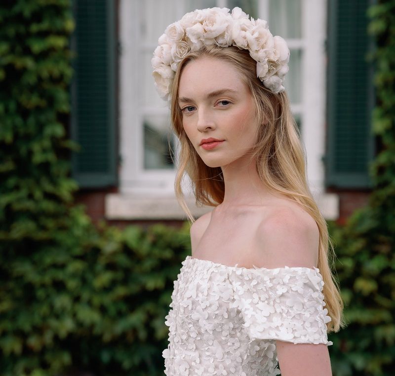 تسريحة شعر عروس مفرودة ومزيّنة بتاج من الورود