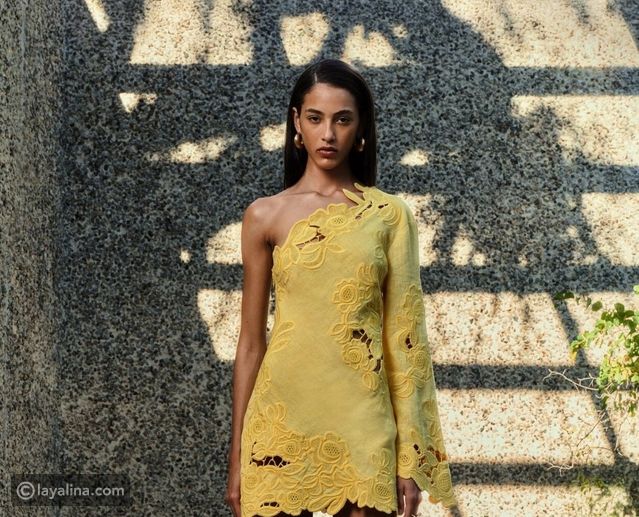 فستان أصفر قصير بتطريزات زهرية بارزة: هذا الفستان يُجسد موضة الملابس المكشوفة التي لا تزال في قمة رواجها؛ حيث يجمع بين: