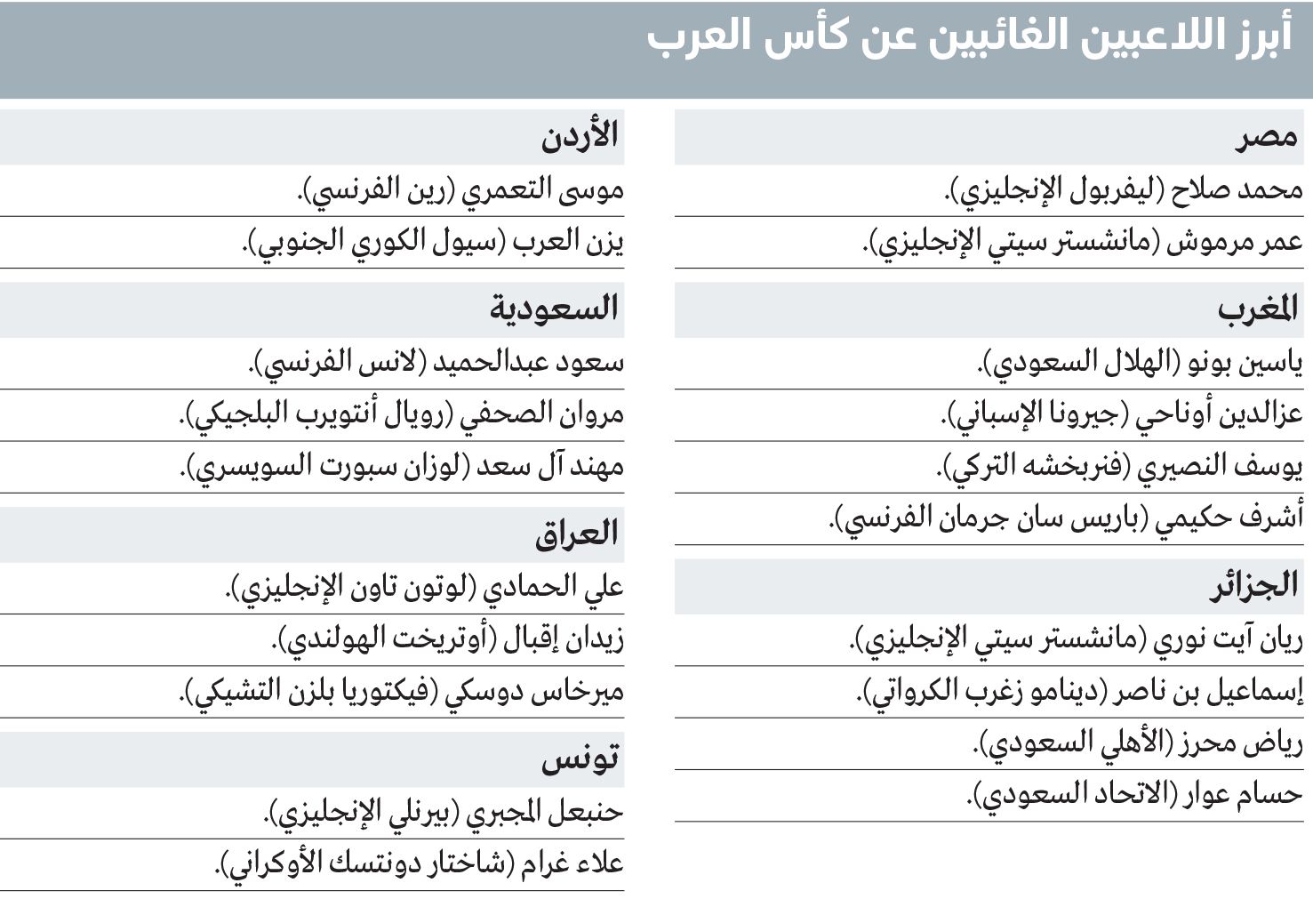 ويتقدّم قائمة الغائبين المصري محمد صلاح (ليفربول الإنجليزي)، وعمر مرموش (مانشستر سيتي الإنجليزي)، إلى جانب المغربيين أشرف حكيمي (باريس سان جيرمان الفرنسي) وعزالدين أوناحي (جيرونا الإسباني)، فضلاً عن الأردني موسى التعمري (رين الفرنسي).