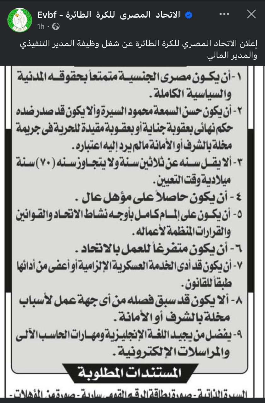 الإثنين، 01 ديسمبر 2025 01:36 مأعلن اتحاد الكرة الطائرة حاجته لشغل منصر المدير التنفيذى والمدير المالى للاتحاد خلال المرحلة المقبلة، وذلك من خلال نشر إعلان عبر الصفحة الرسمية للاتحاد عبر موقع التواصل الإجتماعى "فيس بوك".