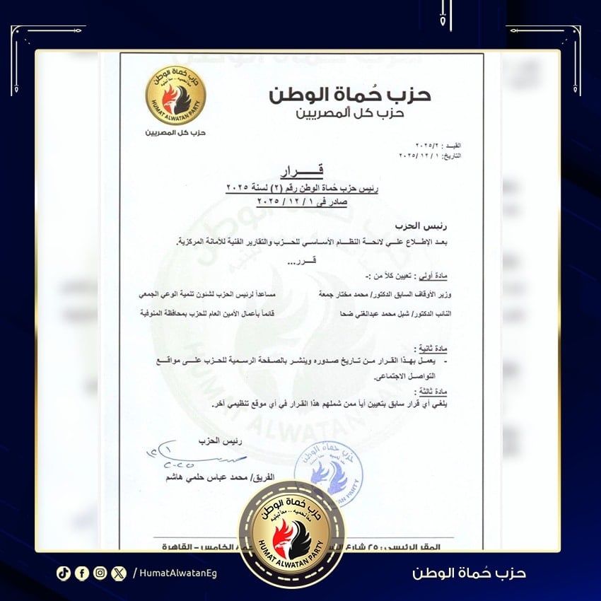 كما تضمن القرارالنائب الدكتور شبل محمد عبد الغني ضحا بمنصب قائم بأعمال الأمين العام للحزب بمحافظة المنوفية.