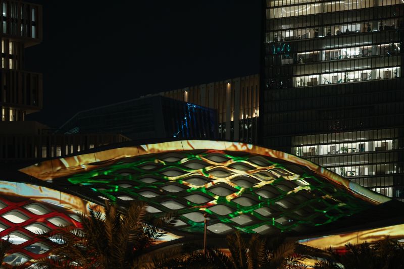 يتحوّل محيط المحطة، خصوصاً الواجهة الخارجية، إلى عنصر بصري يمتد وينكمش في شبكة رقمية مُضاءة، فيبدو البناء المعماري وكأنه يعكس الصورة نفسها في طبقات من الضوء المتغير. وبفضل الموقع وارتفاعات المباني المحيطة، يصبح العمل جزءاً من المشهد الليلي للمركز المالي، لا مجرد تركيب فني داخل محطة.