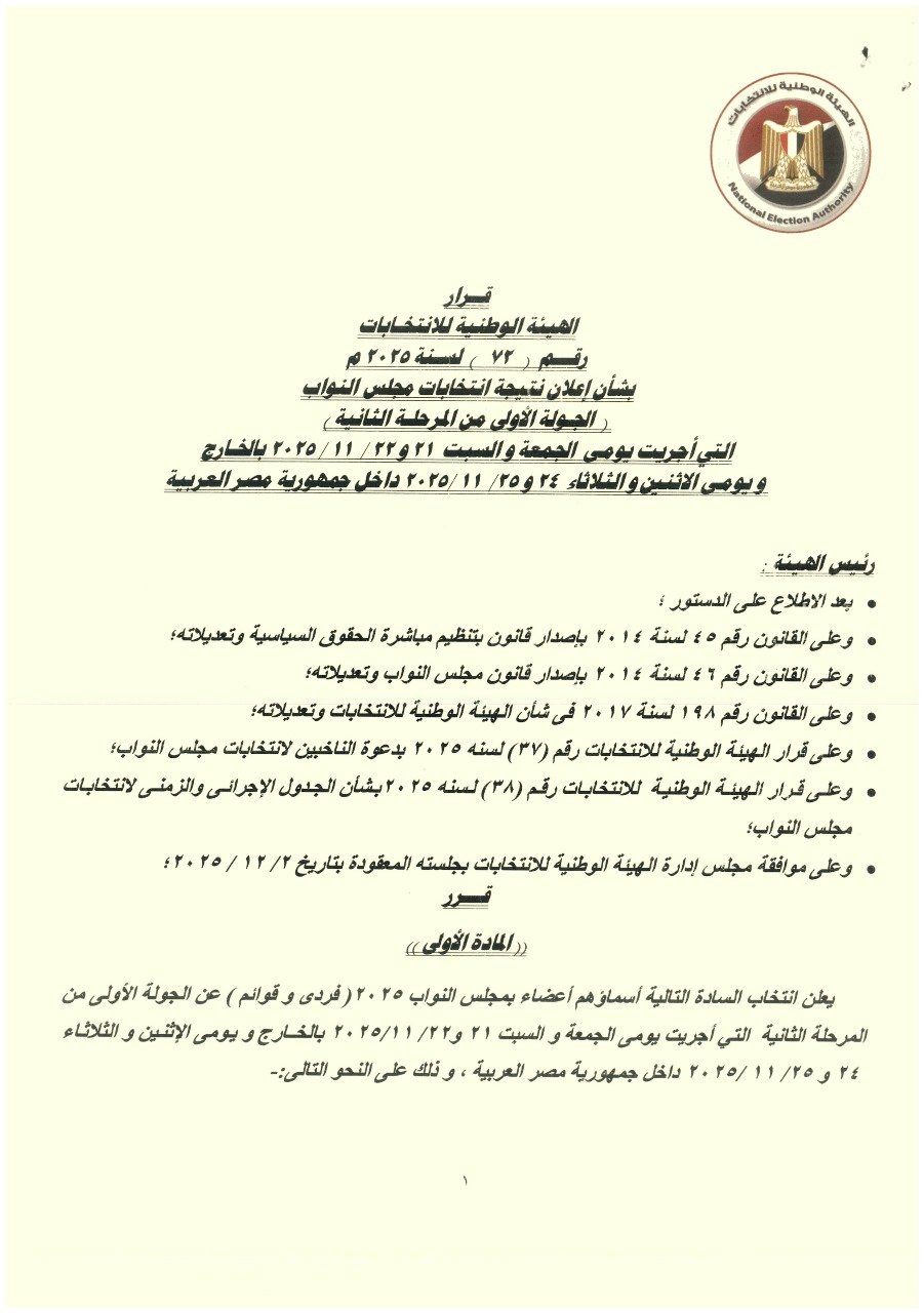 الثلاثاء، 02 ديسمبر 2025 03:53 محصلت اليوم السابع على القائمة الكاملة بأسماء المرشحين الفائزين بالنظام الفردى بالمرحلة الثانية لانتخابات مجلس النواب التى أعلنت الهيئة الوطنية للانتخابات النتيجة الرسمية.