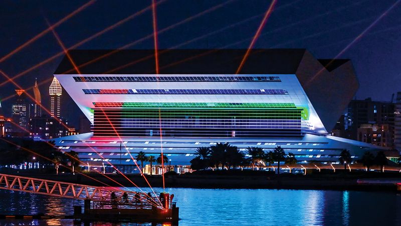 وها هي مكتبة محمد بن راشد تلفت الأنظار بأضواء متلألئة وألوان زاهية، لتصبح رمزاً بارزاً للفرحة الوطنية وروح الاتحاد، وقد انتشرت الأعلام على واجهات المبنى، بينما أضاءت الأنوار الليلية المكتبة، وجعلتها لوحة فنية تنبض بالحياة.