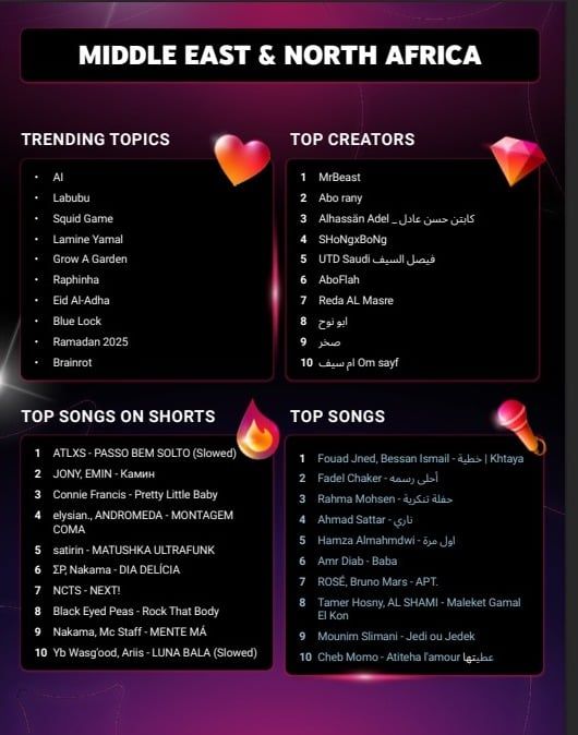 حتى الآن لم يصدر يوتيوب تقرير مفصل لكل دولة، ولكن بحسب بيانه تم عرض المحتويات الرائجة لمنطقة الشرق الأوسط وشمال أفريقيا، والتى جاءت كالتالي: