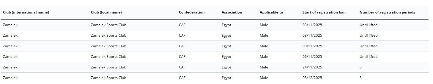ونشر الموقع الرسمي لـ الفيفا، بتاريخ اليوم 3 ديسمبر، إيقاف قيد نادي الزمالك في القضية السادسة.