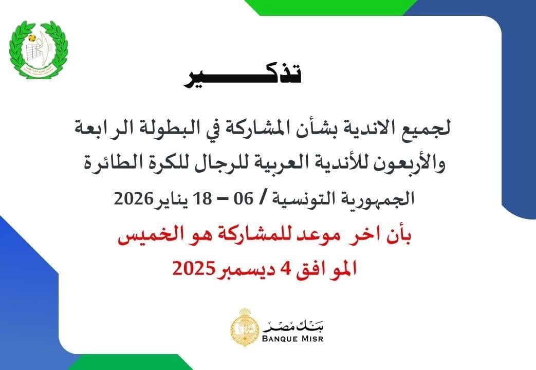 الطائرة يخطر الأندية بأخر موعد لتأكيد المشاركة في البطولة العربية