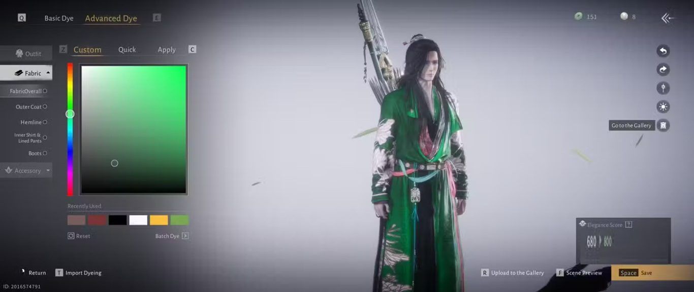 - في واجهة الصباغة، يمكنك تعديل ألوان أجزاء متعددة من الزي، مفصولة حسب القماش والإكسسوارات، مثل: حاشية الثوب، المعطف الخارجي، أو الحذاء.
