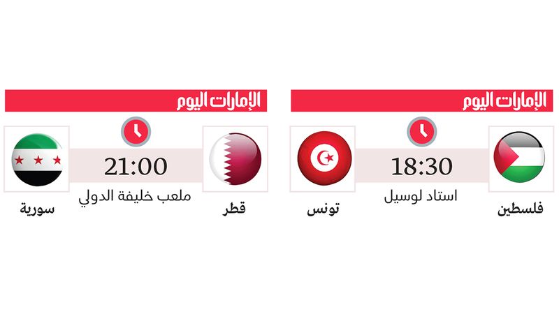 تبحث قطر، مضيفة كأس العرب لكرة القدم، عن تعويض خسارتها المفاجئة أمام فلسطين، عندما تلاقي سورية المنتشية من فوزها على تونس، اليوم، في ثانية جولات المجموعة الأولى.