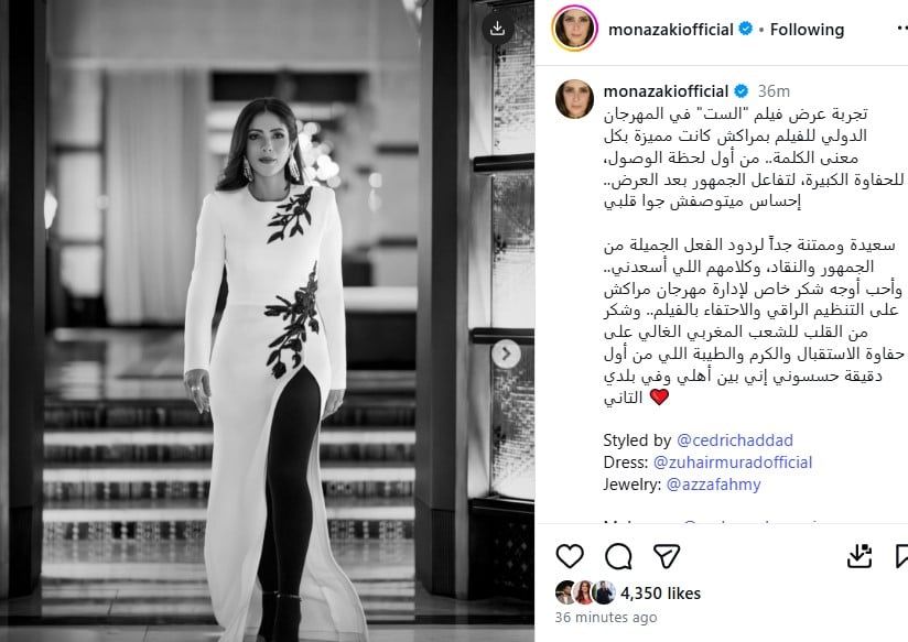 ونشرت منى زكي صورا لها من العرض الخاص للفيلم بمراكش، عبر حسابها على "إنستجرام"، معلقة عليها: "تجربة عرض فيلم "الست" في المهرجان الدولي للفيلم بمراكش كانت مميزة بكل معنى الكلمة.. من أول لحظة الوصول، للحفاوة الكبيرة، لتفاعل الجمهور بعد العرض.. إحساس ميتوصفش جوا قلبي".