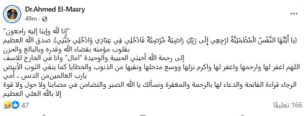 والد الفنان أمير المصرى يعلن وفاة شقيقته