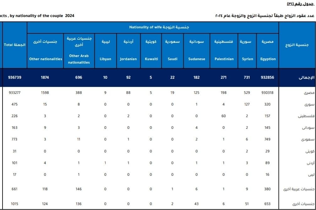 السبت، 06 ديسمبر 2025 01:36 مأظهرت بيانات الجهاز المركزي للتعبئة العامة والإحصاء، أن عقود الزواج المسجلة لجنسيات الزوجات المقيمات في مصر شهدت تسجيل نحو 731 عقد زواج للسوريات في مصر، كان الأغلبية منهم للمصريين بعدد 529 عقد زواج، يليها 127 عقد زواج بين السوريات والسوريين، ثم 6 عقود زواج للسوريات من السعوديين.