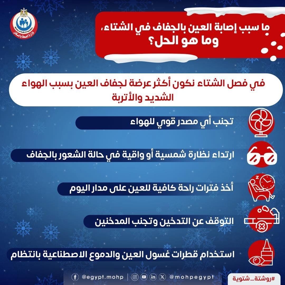 السبت، 06 ديسمبر 2025 02:09 مكشفت وزارة الصحة والسكان عن سبب إصابة العين بالجفاف فى فصل الشتاء، وقالت: فى فصل الشتاء نكون أكثر عرضة لجفاف العين بسبب الهواء الشديد والأتربة.