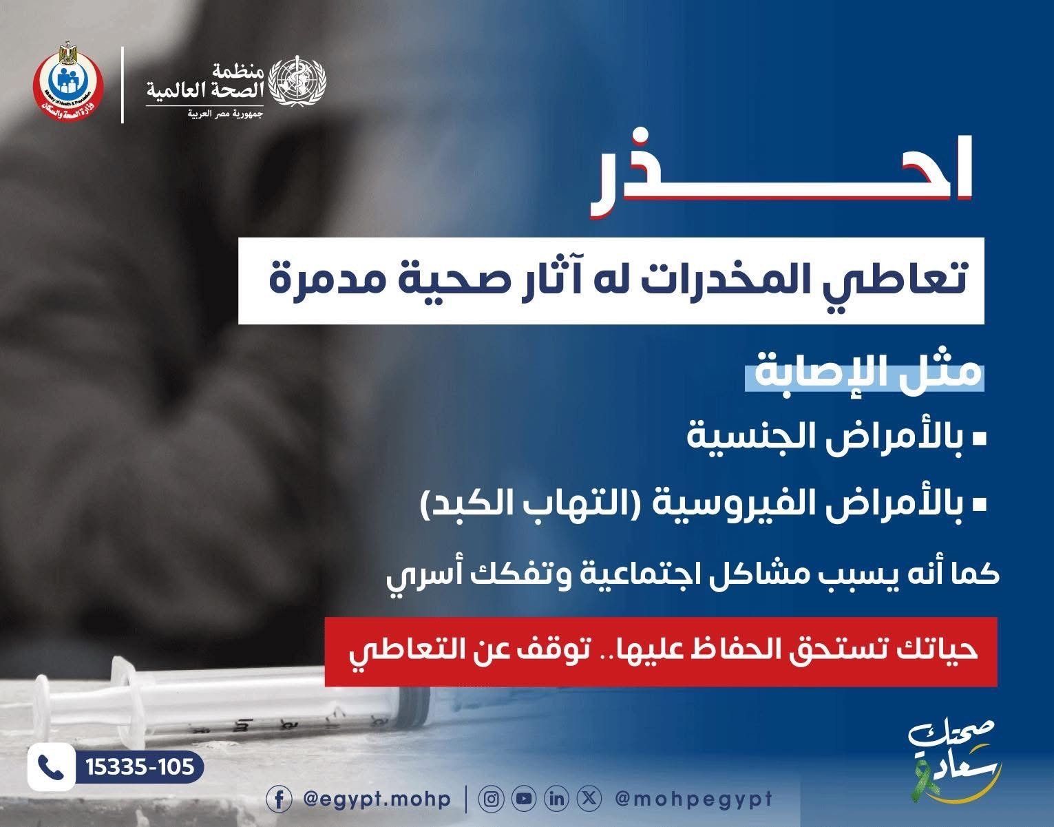 وتابعت وزارة الصحة والسكان : تعاطى المخدرات يسبب مشاكل اجتماعية وتفكك أسري واستكملت : حياتك تستحق الحفاظ عليها.. توقف عن التعاطي.