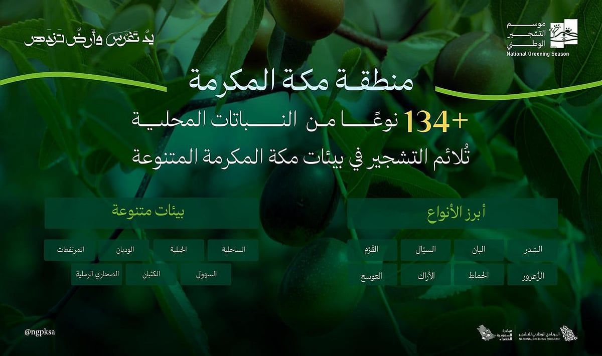 أكد البرنامج الوطني للتشجير، عن انتشار أكثر من 134 نوعًا من النباتات المحلية الملائمة للتشجير في منطقة مكة المكرمة؛ مما يُسهم في تعزيز الجهود الوطنية لتنمية الغطاء النباتي، والحد من تدهور الأراضي في المنطقة، ودعم تحقيق مستهدفات مبادرة السعودية الخضراء، للإسهام في ترسيخ أهمية زراعة النباتات المحلية الملائمة للبيئات المتنوعة، وتحقيق الاستدامة البيئية، تماشيًا مع مستهدفات رؤية المملكة 2030.