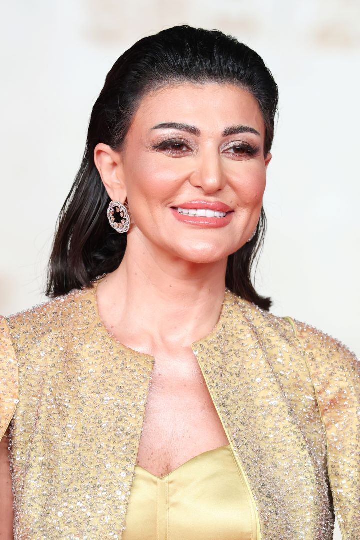 خطفت أسماء جلال الأنظار بمكياج كلاسيكي قوي، إذ اختارت ظلالاً ترابية داكنة وتحديداً واضحاً للعينين مع رموش كثيفة، فيما جاءت الشفاه بلون أحمر مخملي داكن يعكس جرأتها الجمالية.