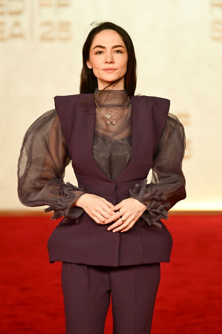 أما تسريحة الشعر، فظهرت بتموجات ويفي عريضة منسدلة على الظهر، مع غرة مبللة مسحوبة إلى الخلف، تمنح اللوك لمسة عصرية وحضوراً قوياً على السجادة الحمراء.