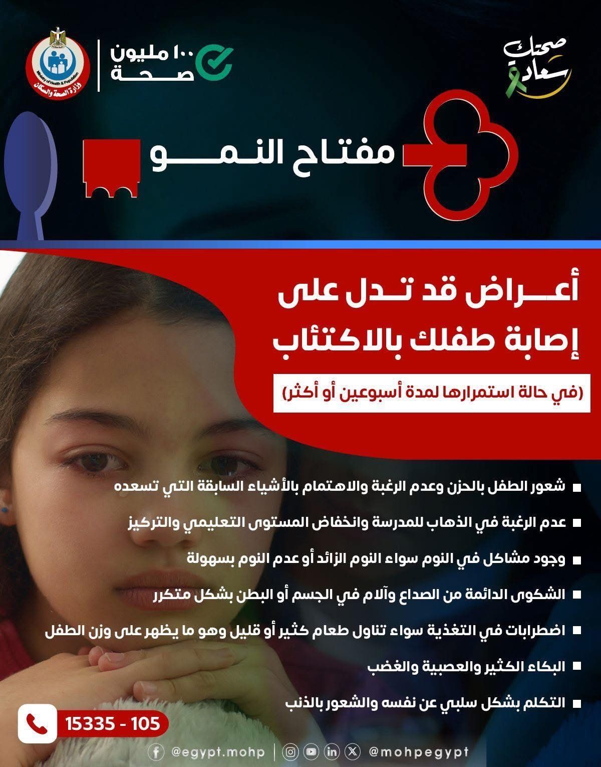 الأحد، 07 ديسمبر 2025 10:48 صكشفت وزارة الصحة والسكان عن أعراض تدل على إصابة الأطفال بـ الاكتئاب في حالة استمرارها لمدة أسبوعين أو أكثر وتتضمن:-