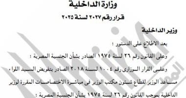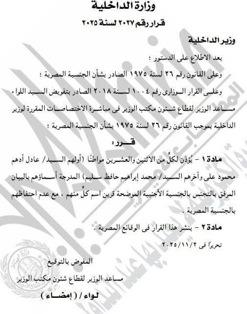 الأحد، 07 ديسمبر 2025 10:40 صنشرت الجريدة الرسمية قرار وزار الداخلية رقم 2027 بشأن السماح لـ21 مواطنا بالتجنيس بجنسيات أجنبية مع احتفاظهم بالجنسية المصرية.